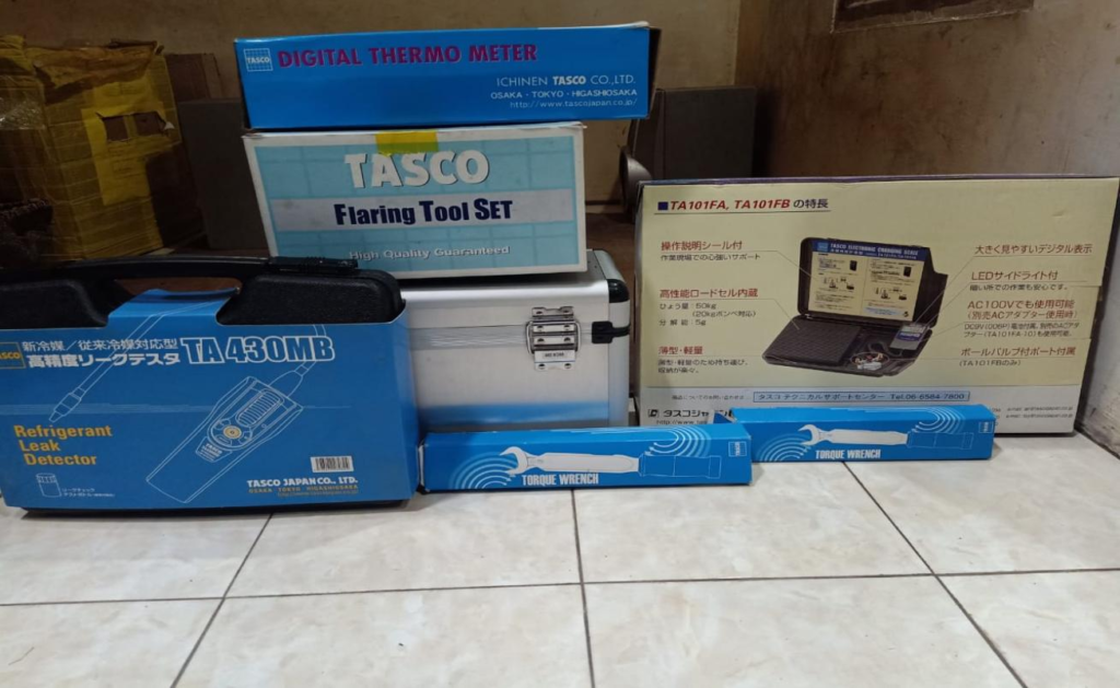 Dalam mendukung kinerja teknisi kami (CV.Galaxcy Electric) yang profesional dan kompeten seluruh teknisi dibekali Tools merk Tasco japan yang telah disupply penuh oleh PT.DAIKIN AIRCONDITIONING INDONESIA. Dengan peralatan yang sudah standart TASCO , dimana tools tersebut yang telah dipakai oleh teknisi Daikin Standart Japan sehingga kinerja teknisi kami (CV Galaxcy Electric) dalam melakukan pekerjaan dilapangan telah sesuai degan standart PT DAIKIN AIRCONDITIONING INDONESIA. Adapun Tools tersebut ialah :
